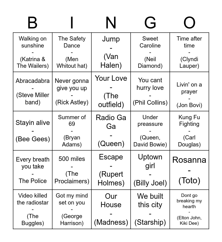 This bingo card has a free space and 34 words: Africa - (Toto), We built this city - (Starship), Eye of the tiger - (Survivor), Take on me - (a-ha), Every breath you take - The Police, Never gonna give you up - (Rick Astley), Time after time - (Clyndi Lauper), Video killed the radiostar - (The Buggles), The Safety Dance - (Men Whitout hat), Gettin'jiggy wit it - (Will Smith), Your Love - (The outfield), Jump - (Van Halen), Don't stop believin - (Journey), Wake me up before you go-go - (Wham!), Under preassure - (Queen, David Bowie), Livin' on a prayer - (Jon Bovi), Got my mind set on you - (George Harrison), Stayin alive - (Bee Gees), 500 miles - (The Proclaimers), Uptown girl - (Billy Joel), Escape - (Rupert Holmes), Come on Eileen - (Dexys Midnight Runners), Walking on sunshine - (Katrina & The Wailers), Kung Fu Fighting - (Carl Douglas), Our House - (Madness), Dont go breaking my hearth - (Elton John, Kiki Dee), Sweet Caroline - (Neil Diamond), Take a chance on me - (ABBA), You cant hurry love - (Phil Collins), Abracadabra - (Steve Miller band), Sweet child O'mine - (Guns N'Roses), Summer of 69 - (Bryan Adams), Rosanna - (Toto) and September - (Earth, Wind & Fire).