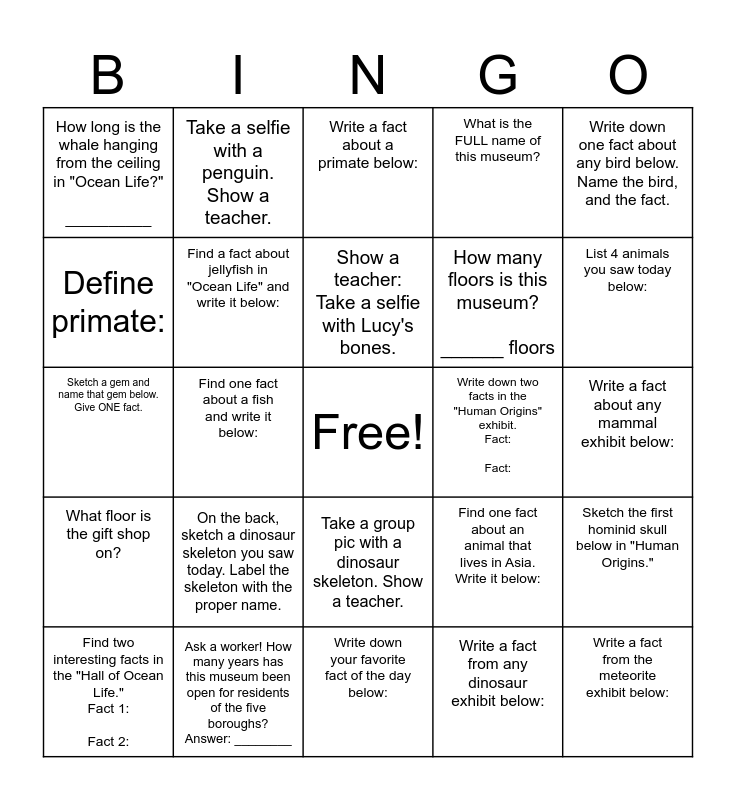 This bingo card has a free space and 24 words: On the back, sketch a dinosaur skeleton you saw today. Label the skeleton with the proper name., Ask a worker! How many years has this museum been open for residents of the five boroughs? Answer: ________, Show a teacher: Take a selfie with Lucy's bones., Find two interesting facts in the "Hall of Ocean Life." Fact 1: Fact 2:, Write down one fact about any bird below. Name the bird, and the fact., How long is the whale hanging from the ceiling in "Ocean Life?" __________, Define primate:, Take a selfie with a penguin. Show a teacher., Write down two facts in the "Human Origins" exhibit. Fact: Fact:, Take a group pic with a dinosaur skeleton. Show a teacher., How many floors is this museum? ______ floors, Sketch a gem and name that gem below. Give ONE fact., Find one fact about an animal that lives in Asia. Write it below:, Sketch the first hominid skull below in "Human Origins.", Find a fact about jellyfish in "Ocean Life" and write it below:, Write a fact from any dinosaur exhibit below:, Write a fact about any mammal exhibit below:, Write a fact about a primate below:, List 4 animals you saw today below:, Find one fact about a fish and write it below:, Write a fact from the meteorite exhibit below:, What floor is the gift shop on?, What is the FULL name of this museum? and Write down your favorite fact of the day below:.