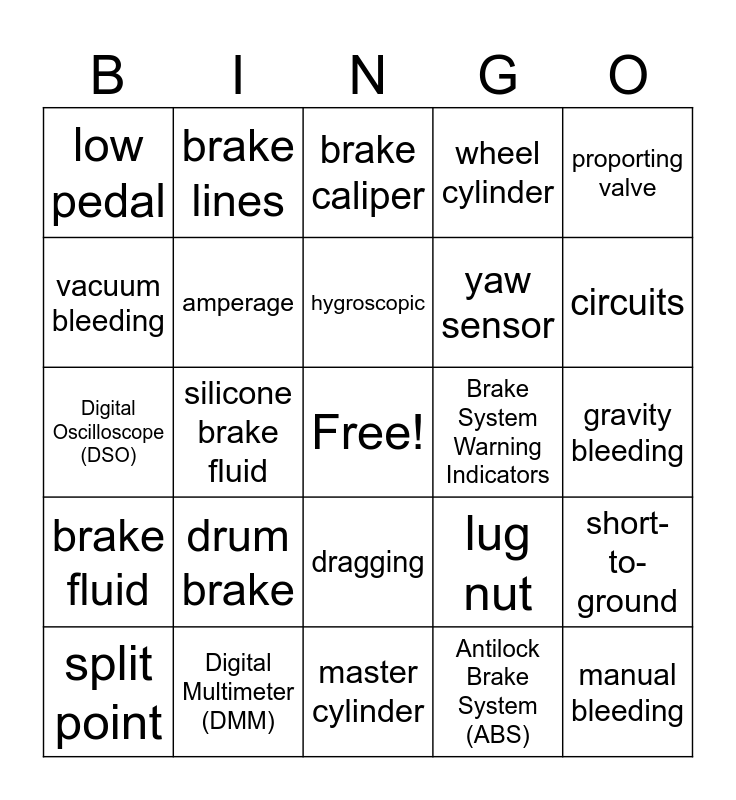 This bingo card has a free space and 34 words: double flare, Antilock Brake System (ABS), banjo bolt, Metering valve, brake fluid, amperage, proporting valve, split point, brake lines, DOT, hygroscopic, brake caliper, RFI stands for, DTC stands for, Brake System Warning Indicators, circuits, Digital Multimeter (DMM), Digital Oscilloscope (DSO), drum brake, lug nut, dragging, hard pedal, low pedal, gravity bleeding, master cylinder, manual bleeding, wheel cylinder, speed sensor, yaw sensor, vacuum bleeding, traction control system, silicone brake fluid, short-to- ground and short-to- voltage.