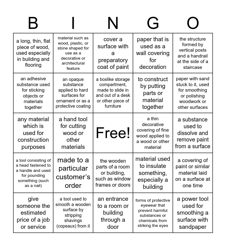 This bingo card has a free space and 25 words: made to a particular customer’s order, an entrance to a room or building through a door, a boxlike storage compartment, made to slide in and out of a desk or other piece of furniture, give someone the estimated price of a job or service, the structure formed by vertical posts and a handrail at the side of a staircase, a long, thin, flat piece of wood, used especially in building and flooring, an adhesive substance used for sticking objects or materials together, material such as wood, plastic, or stone shaped for use as a decorative or architectural feature, a thin decorative covering of fine wood applied to a wood or other material, the wooden parts of a room or building, such as window frames or doors, to construct by putting parts or material together, any material which is used for construction purposes, material used to insulate something, especially a building, a covering of paint or similar material laid on a surface at one time, an opaque substance applied to hard surfaces for ornament or as a protective coating, the process of protecting a wooden surface and the material used to protect it, a substance used to dissolve and remove paint from a surface, cover a surface with a preparatory coat of paint, paper with sand stuck to it, used for smoothing or polishing woodwork or other surfaces, a hand tool for cutting wood or other materials, a power tool used for smoothing a surface with sandpaper, a tool used to smooth a wooden surface by stripping shavings (copeaux) from it, a tool consisting of a head fastened to a handle and used for pounding something (such as a nail), paper that is used as a wall covering for decoration and forms of protective eyewear that prevent harmful substances or chemicals from striking the eyes.