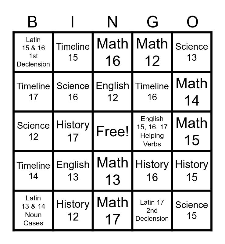 This bingo card has a free space and 31 words: Math 17, Science 17, History 17, History 13, Latin 15 & 16 1st Declension, Math 16, Science 16, History 16, English 15, 16, 17 Helping Verbs, Latin 17 2nd Declension, Math 15, Science 15, English 14, Timeline 13, Math 14, Science 14, History 15, English 13, Timeline 14, Math 13, Science 13, History 14, Latin 13 & 14 Noun Cases, Timeline 15, Timeline 16, Timeline 17, Math 12, Science 12, History 12, English 12 and Timeline 12.