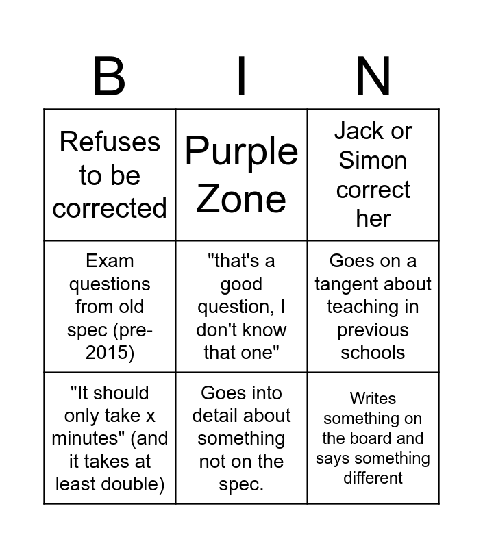 This bingo card has a free space and 8 words: Goes on a tangent about teaching in previous schools, Jack or Simon correct her, Purple Zone, "It should only take x minutes" (and it takes at least double), Refuses to be corrected, Writes something on the board and says something different, Exam questions from old spec (pre-2015) and Goes into detail about something not on the spec..