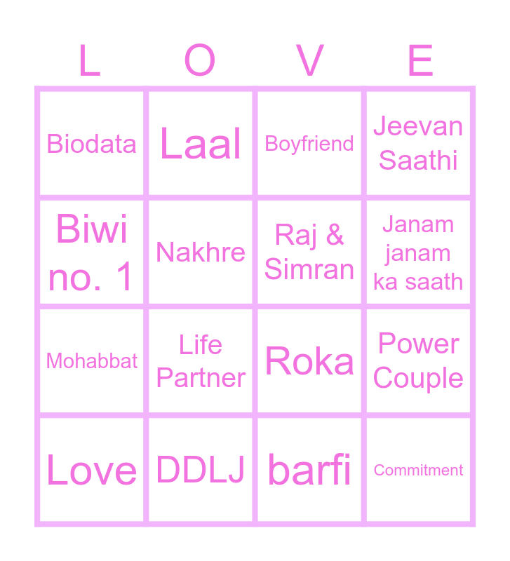 This bingo card has 43 words: Marriage, Love, Happiness, Flowers, Chocolate, Rose, Boyfriend, Girlfriend, Biwi no. 1, Pati Parmeshwar, Jeevan Saathi, DDLJ, Kuch Kuch Hota Hai, Gopi, Arranged Marriage, Pyar Dosti Hai, Ishq, Roka, Engagement, Life Partner, Laal, Romeo, Shaadi.com, Biodata, Tuj me rab dikta hai, barfi, romance, Jab we met, wife is always right, Commitment, Passion, Pariwar, Pink, Power Couple, EK Chutki Sindoor, Dil deewana, Mann mohini, Janam janam ka saath, Nakhre, Mohabbat, All izz well, Raj & Simran and sapno ki heroine.