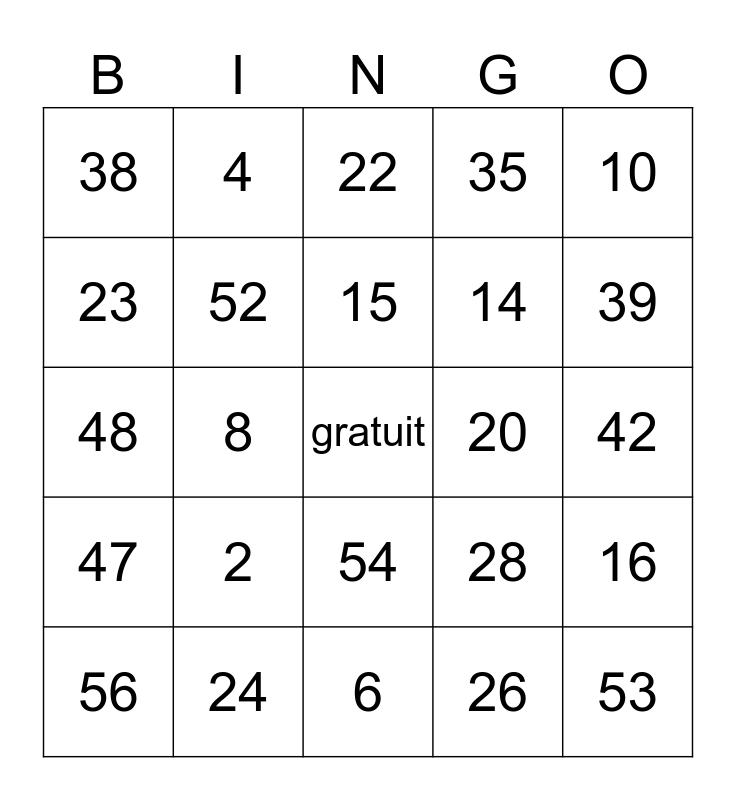 This bingo card has a free space and 24 words: 2, 24, 15, 56, 10, 38, 23, 4, 20, 54, 14, 48, 28, 16, 52, 26, 42, 22, 39, 8, 53, 47, 35 and 6.