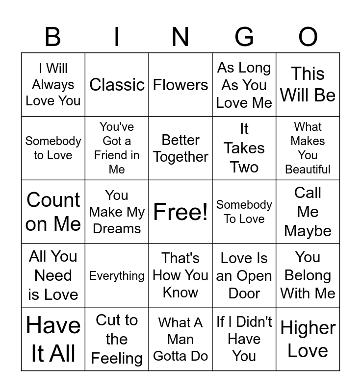 This bingo card has a free space and 36 words: L-O-V-E, My Girl, Ain't No Mountain High Enough, You've Got a Friend in Me, Love Is an Open Door, All You Need is Love, Better Together, Love Story, This Will Be, Don't Go Breaking My Heart, You Make My Dreams, As Long As You Love Me, Baby, Somebody To Love, What Makes You Beautiful, I Will Always Love You, Our Song, Everything, Higher Love, Flowers, Call Me Maybe, You Belong With Me, Cut to the Feeling, Have It All, What A Man Gotta Do, Classic, Count on Me, Brown Eyed Girl, It Takes Two, Somebody to Love, Perfect Duet, You'll Be In My Heart, If I Didn't Have You, That's How You Know, Enchanted and Lil Boo Thang.