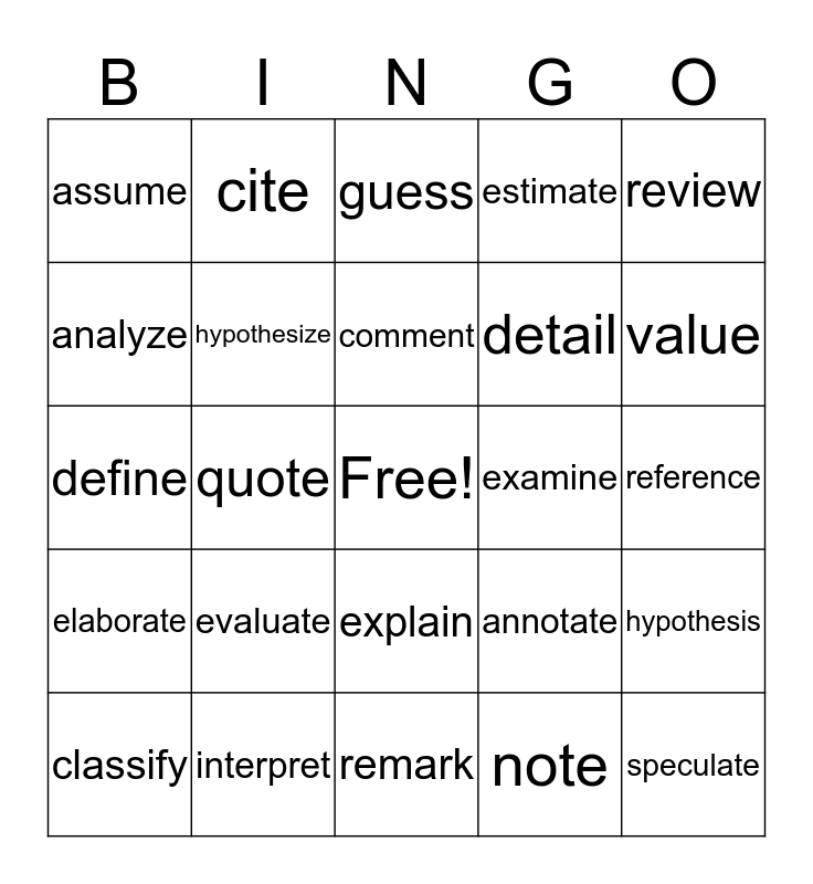 This bingo card has a free space and 24 words: evaluate, interpret, comment, classify, review, assume, analyze, cite, examine, explain, detail, define, annotate, hypothesis, hypothesize, note, reference, guess, value, quote, speculate, elaborate, estimate and remark.