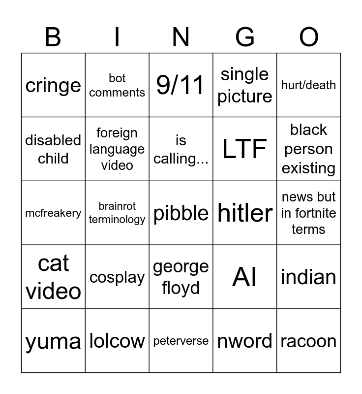 This bingo card has 30 words: lolcow, lebron, brainrot terminology, creature, cringe, 9/11, foreign language video, george floyd, hitler, peterverse, news but in fortnite terms, pibble, nword, racoon, black person existing, "send this...", AI, cat video, cosplay, hurt/death, mcfreakery, thirst trap, bot comments, LTF, disabled child, single picture, indian, yuma, is calling... and STUPID SMILING DOG.