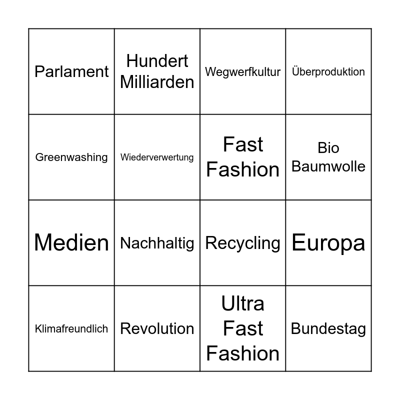 This bingo card has 16 words: Revolution, Europa, Wegwerfkultur, Parlament, Medien, Hundert Milliarden, Recycling, Ultra Fast Fashion, Greenwashing, Wiederverwertung, Klimafreundlich, Überproduktion, Nachhaltig, Bio Baumwolle, Fast Fashion and Bundestag.