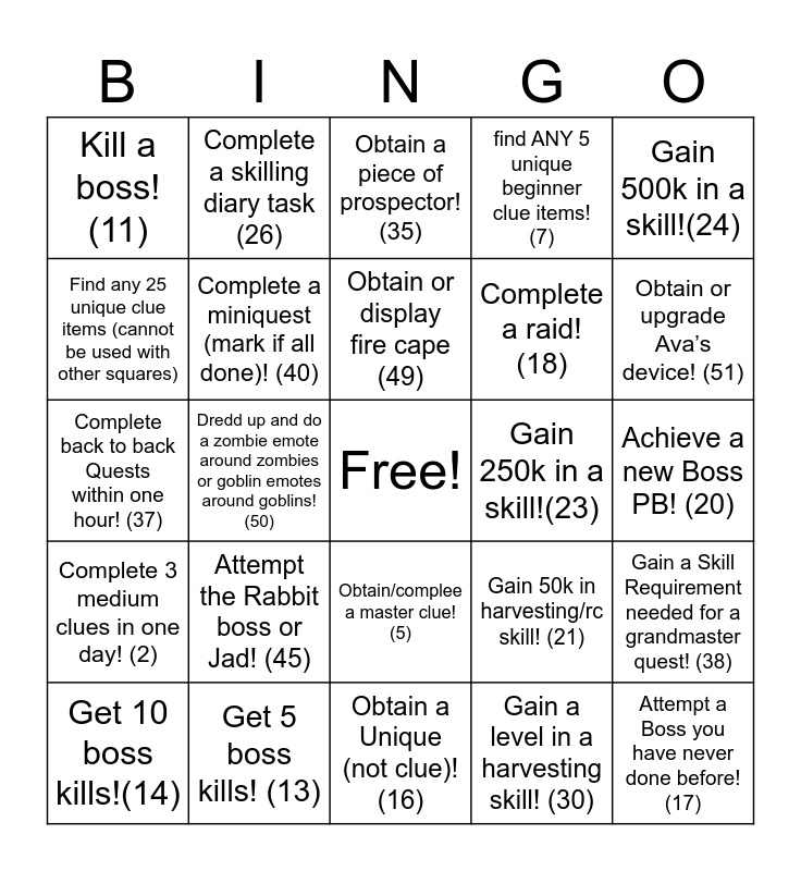This bingo card has a free space and 54 words: Complete an 5 easy clues in one day! (1), Complete 3 medium clues in one day! (2), Obtain/Complete a hard clue in one day! (3), Obtain/complete an elite clue! (4), Obtain/complee a master clue! (5), Obtain 3 clog from clues! (6), find ANY 5 unique beginner clue items!(7), Find any 10 Clue items (cannot be used with other squares)! (8), Find any 25 unique clue items (cannot be used with other squares), Obtain and Beginner Clue within 10 minutes of obtaining (10), Kill a boss!(11), Kill a Wilderness boss! (12), Get 5 boss kills! (13), Get 10 boss kills!(14), Complete a combat achievement! (15), Obtain a Unique (not clue)! (16), Attempt a Boss you have never done before! (17), Complete a raid! (18), Obtain a clog (not clue)! (19), Achieve a new Boss PB! (20), Gain 50k in harvesting/rc skill! (21), Gain 100k in a skill!(22), Gain 250k in a skill!(23), Gain 500k in a skill!(24), Try a 1ting method (silver key approved) (25), Complete a skilling diary task (26), Obtain a piece or set for Skilling!(27), Train a skill in a way you have not tried yet! (28), Do a Skilling boss! (29), Gain a level in a harvesting skill! (30), Reach a Short term Skilling goal! (silver key approved) (31), Complete a Diary! (32), : Complete a Quest! (33), Attempt a Diary required boss! (34), Obtain a piece of prospector! (35), Kill 200 ochompies! (36), Complete back to back Quests within one hour! (37), Gain a Skill Requirement needed for a grandmaster quest! (38), 250k nmz! (39), Complete a miniquest (mark if all done)! (40), Host a clan event/skilling meetup/recruit (41), Help somebody with their Bingo Card! (42), Attend another users Clan Event! (43), Obtain five untradeables! (44), Attempt the Rabbit boss or Jad! (45), Unlock the “dead can dance” music track! (46), Free (47), Obtain Barrows gloves /dragon defender! (48), Obtain or display fire cape (49), Dredd up and do a zombie emote around zombies or goblin emotes around goblins! (50), Obtain or upgrade Ava’s device! (51), Obtain or upgrade Mage arena cape! (52), Try some pvp, such as through lms (53) and Discover and unlock a new area or location on the map! (54).