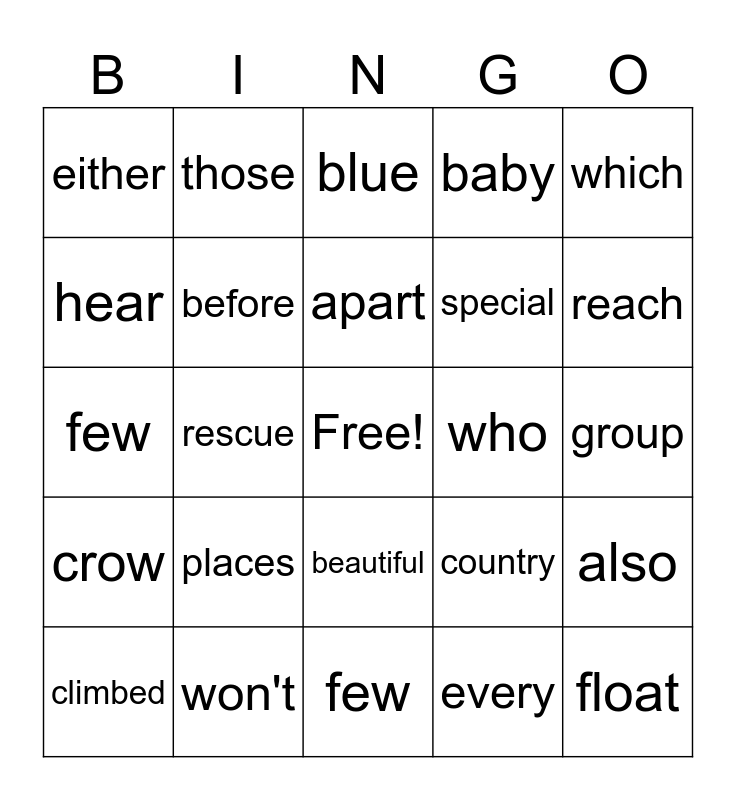 This bingo card has a free space and 24 words: places, won't, apart, climbed, which, either, hear, those, who, beautiful, special, few, country, also, before, every, group, blue, reach, rescue, float, crow, baby and few.