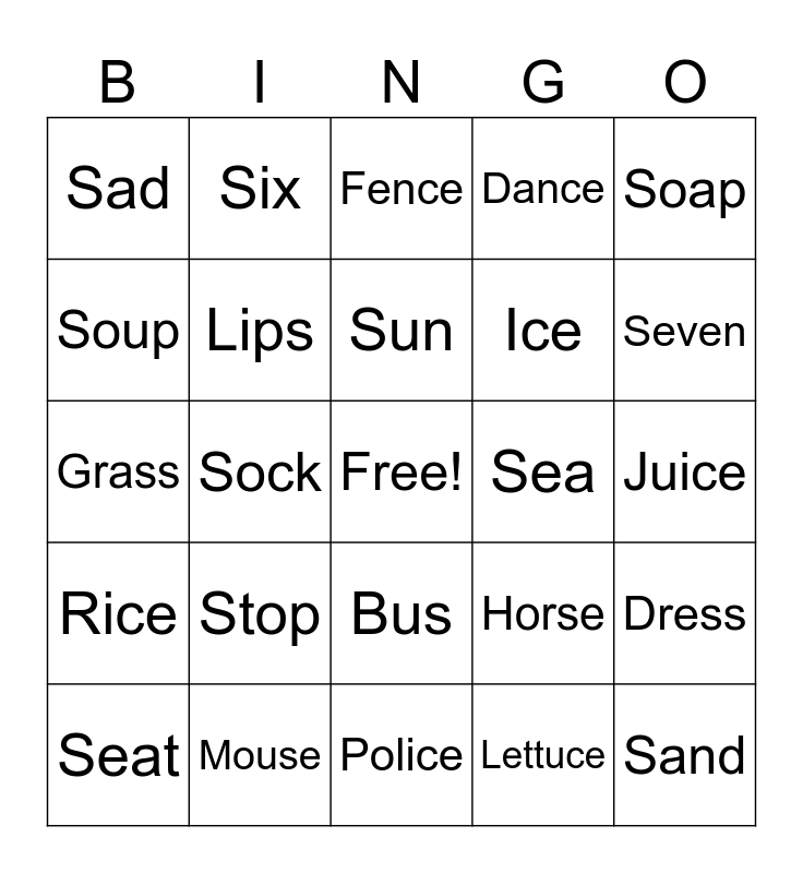 This bingo card has a free space and 24 words: Stop, Mouse, Sun, Seat, Soap, Sad, Soup, Six, Sea, Bus, Ice, Grass, Horse, Dress, Lips, Lettuce, Juice, Fence, Seven, Sock, Sand, Rice, Dance and Police.