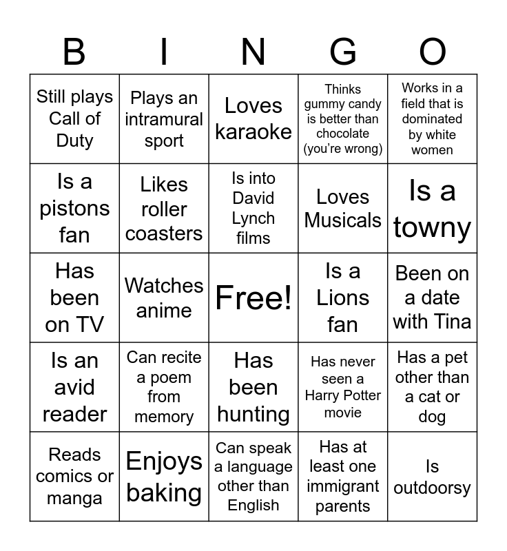 This bingo card has a free space and 28 words: Has a pet other than a cat or dog, Plays Dnd or Magic the Gathering, Loves Musicals, Has at least one immigrant parents, Is a pistons fan, Loves karaoke, Plays an intramural sport, Is an avid reader, Is a Lions fan, Reads comics or manga, Has been on TV, Thinks gummy candy is better than chocolate (you’re wrong), Enjoys baking, Can speak a language other than English, Is a towny, Goes to the gym regularly, Can recite a poem from memory, Likes roller coasters, Is into David Lynch films, Has been hunting, Still plays Call of Duty, Sleeps naked, Is outdoorsy, Watches anime, Been on a date with Tina, Has never seen a Harry Potter movie, Works in a field that is dominated by white women and Is an only child.