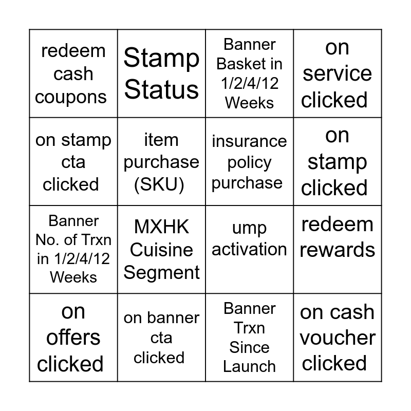 This bingo card has 35 words: redemption, burn offer, save offer , insurance policy purchase , points sharing , on service clicked , item purchase (SKU) , transaction purchase, on stamp clicked , save stamp , ump activation , on stamp cta clicked , member enrollment, on banner clicked , redeem cash coupons , on banner cta clicked , on offer cta clicked , redeem rewards , on cash voucher clicked , on offers clicked , on rewards clicked , on rewards cta clicked , RFM segment, yuu Category Propensity, Banner Basket in 1/2/4/12 Weeks, MXHK Cuisine Segment, Banner Weekly Average Sales, Banner Trxn Since Launch, Banner No. of Trxn in 1/2/4/12 Weeks, Banner Trxn Since Launch, Banner total sales in 1/2/4/8/12 Weeks, yuu Segment, Behavioral Segment by banner , Stamp Status and Location Segment.