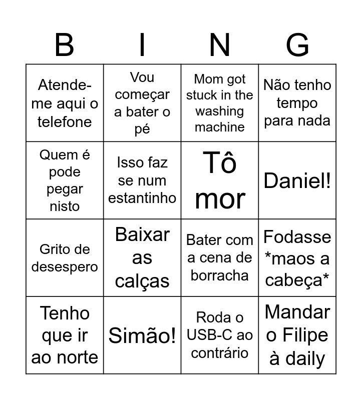 This bingo card has 25 words: Tirar do baú, Filipe!, Daniel!, Joel!, Quem é pode pegar nisto, Atende-me aqui o telefone, Isso faz se num estantinho, Vou começar a bater o pé, Simão!, Aaah..aaah.aaahh, Grito de desespero, Bater com a cena de borracha, Atender uma chamada a meio de uma conversa, "Ia sendo despedido" (não ia, historia sem jeito), Tô mor, Ficar orgulhoso de fazer o trabalho dele, Roda o USB-C ao contrário, Mom got stuck in the washing machine, Baixar as calças, Fodasse *maos a cabeça*, Tenho que ir ao norte, Perguntar a mesma merda 30x, Mandar o Filipe à daily, Não tenho tempo para nada and Estou a responder a emails.