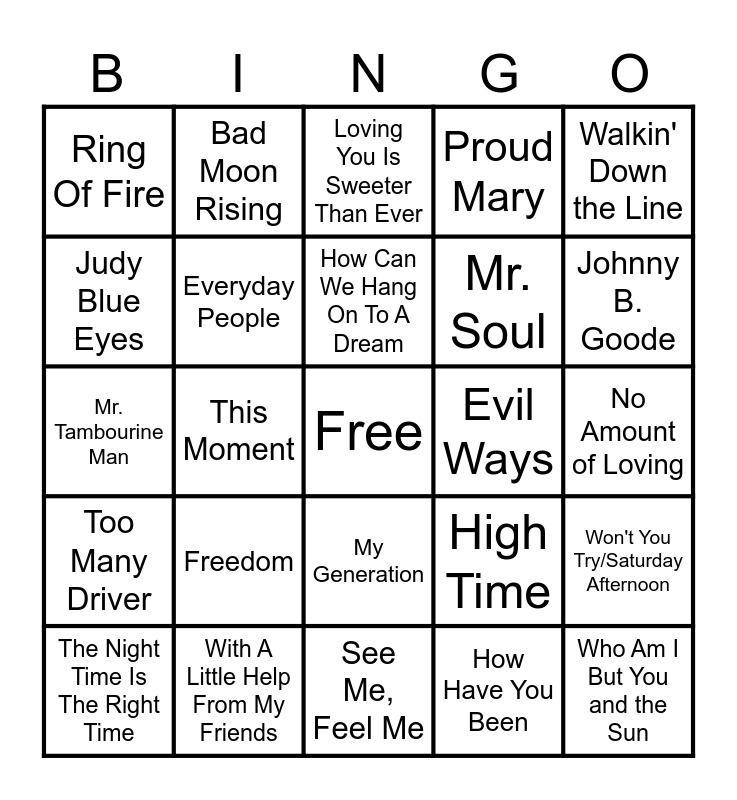 This bingo card has a free space and 35 words: Going up the Country, Voodoo Child, Soul Sacrifice, Everyday People, My Generation, Proud Mary, Judy Blue Eyes, Why Oh Why, How Can We Hang On To A Dream, Simple Song of Freedom, Mr. Tambourine Man, Walkin' Down the Line, Swing Low, Sweet Chariot, They Live the Life, Ring Of Fire, Evil Ways, How Have You Been, This Moment, Too Many Driver, Who Am I But You and the Sun, High Time, The Night Time Is The Right Time, Won't You Try/Saturday Afternoon, With A Little Help From My Friends, Loving You Is Sweeter Than Ever, Johnny B. Goode, Stand!, Somethin' Comin' On, Mr. Soul, No Amount of Loving, Come Go with Me, Fire, See Me, Feel Me, Freedom, Bad Moon Rising and Purple Haze.