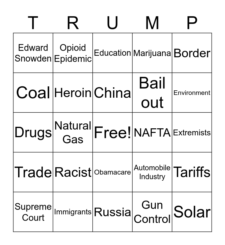 This bingo card has a free space and 77 words: Benghazi, Veterans, Education, Islamic Terrorist, September 11th, 3 am phone call, Mexico, Iran, Iraq, Afghanistan, Saudi Arabia, North Korea, China, Coal, Oil, Natural Gas, Wind, Solar, Climate Change, Border, Build a Wall, Drugs, Heroin, Opioid Epidemic, Marijuana, Trump University, Clinton Foundation, Scandal, e-mail, Department of State, Bankruptcy, Military, ISIS, Automobile Industry, Environment, Bail out, Wall Street, Entitlements, Extremists, Gun Control, NRA, 2nd Amendment, Planned Parenthood, Abortion, Constitution, Guantanamo Bay, Supreme Court, Edward Snowden, Sharia Law, Unemployment, Social Security, Obamacare, Congress, Bipartisan, Executive Order, Department of State, Democrat, Republican, Children, Black Lives Matter, Racist, Race Relations, Law Enforcement, Unions, Ferguson, Pipeline, Infrastructure, NAFTA, Deport, TPP, NATO, Tariffs, Trade, Immigrants, Visas, Russia and Putin.