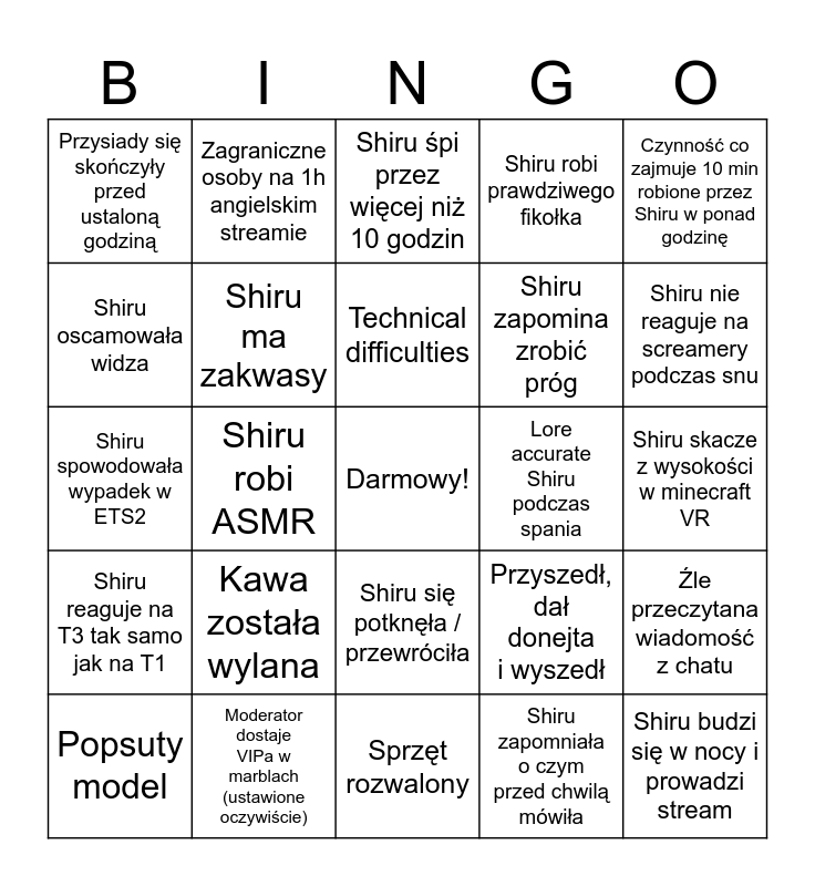 This bingo card has a free space and 24 words: Kawa została wylana, Moderator dostaje VIPa w marblach (ustawione oczywiście), Technical difficulties, Popsuty model, Czynność co zajmuje 10 min robione przez Shiru w ponad godzinę, Przysiady się skończyły przed ustaloną godziną, Shiru oscamowała widza, Zagraniczne osoby na 1h angielskim streamie, Lore accurate Shiru podczas spania, Shiru się potknęła / przewróciła, Shiru zapomina zrobić próg, Shiru spowodowała wypadek w ETS2, Przyszedł, dał donejta i wyszedł, Źle przeczytana wiadomość z chatu, Shiru ma zakwasy, Shiru zapomniała o czym przed chwilą mówiła, Shiru skacze z wysokości w minecraft VR, Shiru śpi przez więcej niż 10 godzin, Shiru nie reaguje na screamery podczas snu, Shiru robi ASMR, Shiru budzi się w nocy i prowadzi stream, Shiru reaguje na T3 tak samo jak na T1, Shiru robi prawdziwego fikołka and Sprzęt rozwalony.