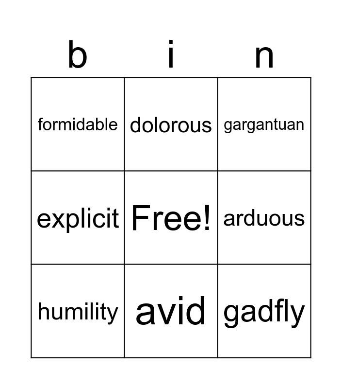 This bingo card has a free space and 11 words: epistle, avid, gadfly, humility, dolorous, gargantuan, arduous, affable, explicit, formidable and agrarian.