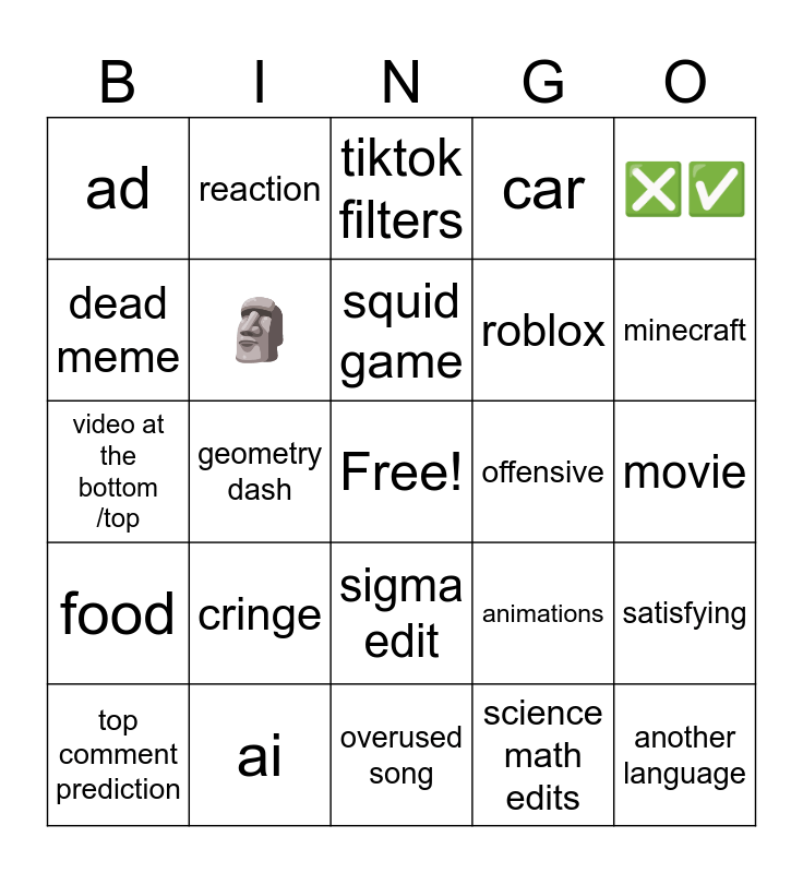 This bingo card has a free space and 24 words: cringe, ai, squid game, top comment prediction, ❎✅, ad, dead meme, reaction, offensive, sigma edit, roblox, video at the bottom /top, animations, satisfying, 🗿, science math edits, movie, tiktok filters, minecraft, geometry dash, another language, food, car and overused song.