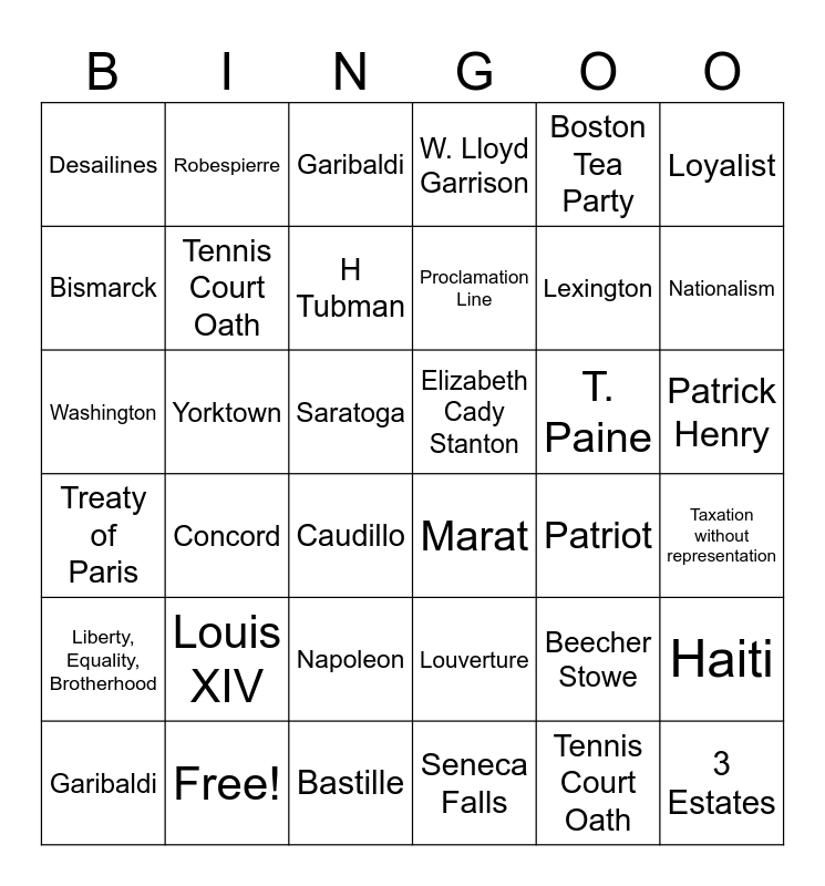 This bingo card has 39 words: Free!, Garibaldi, Women's Suffrage, Bismarck, Caudillo, Patrick Henry, Tennis Court Oath, 3 Estates, Boston Tea Party, Elizabeth Cady Stanton, Nationalism, W. Lloyd Garrison, Washington, Saratoga, Yorktown, T. Paine, Beecher Stowe, Desailines, Bastille, Treaty of Paris, Loyalist, Patriot, H Tubman, Proclamation Line, Seneca Falls, Napoleon, Liberty, Equality, Brotherhood, Tennis Court Oath, Louis XIV, Robespierre, Minutemen, Haiti, Garibaldi, Marat, Taxation without representation, Louverture, Concord, Lexington and Guillotine.