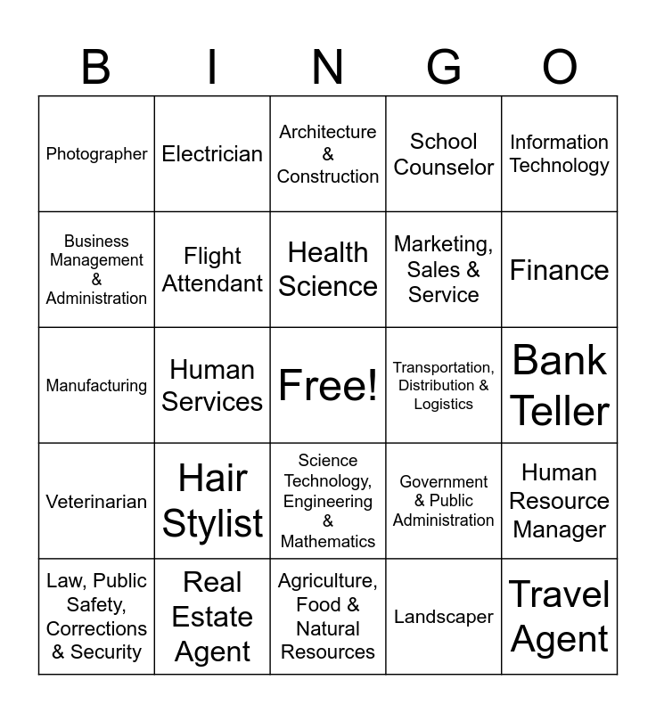 This bingo card has a free space and 24 words: Hair Stylist, Real Estate Agent, Health Science, Law, Public Safety, Corrections & Security, Information Technology, Photographer, Business Management & Administration, Electrician, Transportation, Distribution & Logistics, Science Technology, Engineering & Mathematics, Marketing, Sales & Service, Manufacturing, Government & Public Administration, Human Resource Manager, Flight Attendant, Landscaper, Bank Teller, Architecture & Construction, Finance, Human Services, Travel Agent, Veterinarian, School Counselor and Agriculture, Food & Natural Resources.