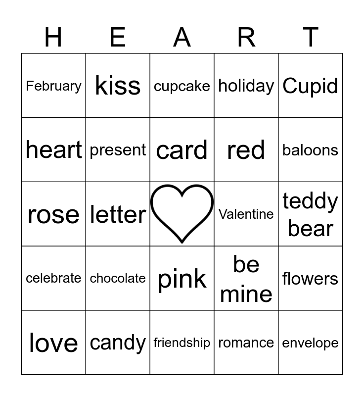 This bingo card has a free space and 24 words: chocolate, candy, card, love, Cupid, February, heart, kiss, Valentine, pink, red, rose, be mine, flowers, present, romance, teddy bear, cupcake, baloons, letter, envelope, celebrate, holiday and friendship.