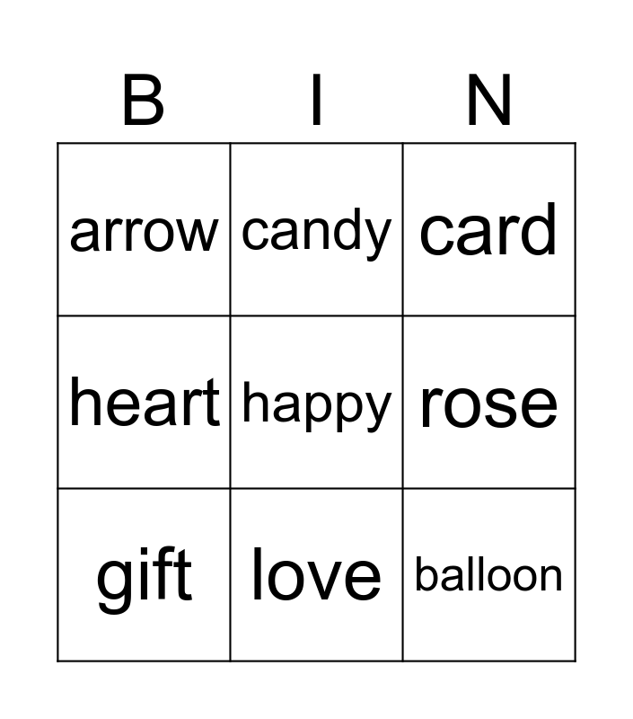 This bingo card has a free space and 8 words: heart, candy, rose, gift, card, arrow, love and balloon.