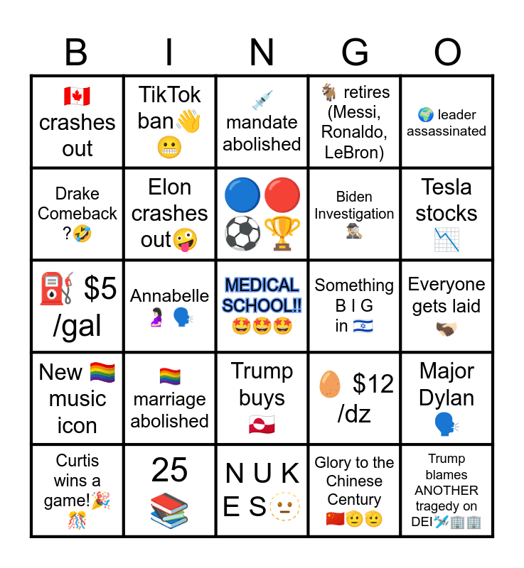 This bingo card has a free space and 24 words: ๐ณ๏ธโ๐ marriage abolished, 25 ๐, ๐ต๐ดโฝ๏ธ๐, Curtis wins a game!๐๐, ๐ leader assassinated, ๐จ๐ฆ crashes out, Drake Comeback ?๐คฃ, TikTok ban๐๐ฌ, Something B I G in ๐ฎ๐ฑ, Trump buys ๐ฌ๐ฑ, Biden Investigation ๐ต๐ผโโ๏ธ, โฝ๏ธ $5 /gal, ๐ฅ $12 /dz, Major Dylan ๐ฃ๏ธ, Elon crashes out๐คช, Glory to the Chinese Century ๐จ๐ณ๐ซก๐ซก, Everyone gets laid๐ซฑ๐ฟโ๐ซฒ๐ป, ๐ mandate abolished, Tesla stocks๐, Annabelle ๐คฐ๐ป ๐ฃ๏ธ, Trump blames ANOTHER tragedy on DEI๐ฉ๏ธ๐ข๐ข, New ๐ณ๏ธโ๐ music icon, ๐ retires (Messi, Ronaldo, LeBron) and N U K E S๐ซฅ.