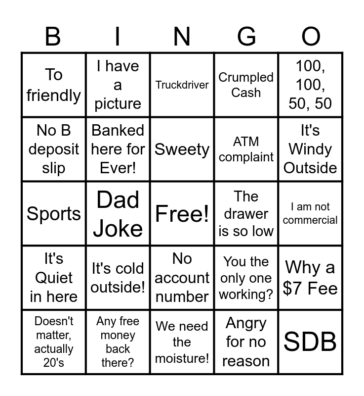 This bingo card has a free space and 24 words: It's cold outside!, Any free money back there?, Sweety, Doesn't matter, actually 20's, 100, 100, 50, 50, To friendly, No B deposit slip, I have a picture, The drawer is so low, No account number, ATM complaint, Sports, You the only one working?, Why a $7 Fee, Banked here for Ever!, Angry for no reason, I am not commercial, Truckdriver, It's Windy Outside, Dad Joke, SDB, It's Quiet in here, Crumpled Cash and We need the moisture!.