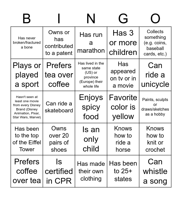 This bingo card has 88 words: Can speak 3+ languages, Is a middle child, Is an only child, Has a twin in immediate family, Is the youngest child, Has a dog, Has a cat, Has a pet that isn’t a dog or a cat, Has a Vision Pro, Uses an Android phone primarily on the Apple team/Uses an iPhone primarily on the Android team, Plays more than one instrument, Plays in a band, Knows how to knit or crochet, Paints, sculpts or draws/sketches as a hobby, Has been on a flight over 12 hours, Has lived in the same state (US) or province (Europe) their whole life, Has been to the north or south pole, Has a birthday this month, Has a tattoo, Is vegetarian or vegan, Has met a celebrity, Is related to a celebrity, Hasn't seen at least one movie from every Disney Brand (Disney Animation, Pixar, Star Wars, Marvel), Is left-handed, Has been to 25+ states, Has been to 5+ countries, Has been to 3+ continents, Has never left the country they live in, Has run a 5k, Has run a half marathon, Has run a marathon, Has 3 or more children, Is a morning person, Is a night owl, Owns over 20 pairs of shoes, Plays or played a sport, Has never broken/fractured a bone, Drives a truck, Rides a motorcycle, Can ride a unicycle, Can ride a skateboard, Was born/raised in another country from where they currently live, Has moved due to a natural disaster, Knows how to ride a horse, Favorite color is yellow, Favorite color is red, Has been in a parade, Has an IMDB credit, Has a Wikipedia page, Has appeared on tv or in a movie, Has been to a movie or TV show premiere, Has never been to Disneyland/Disney World, Is wearing yellow, Has been to a major playoff or championship game (e.g. Stanley Cup, World Series, Superbowl), Has been on a podcast, Has hosted their own radio show, Has been to the top of the Eiffel Tower, Owns or has contributed to a patent, Has sold an item on eBay, Has experienced a paranormal or unexplainable event, Played in a band (Non-school), Has seen one of the Wonders of the World, Has made and sold art, Can juggle, Is a certified scuba diver, Is certified in CPR, Can solve a Rubiks cube, Prefers tea over coffee, Prefers coffee over tea, Enjoys spicy food, Can whistle a song, Has a garden or house plants, Wears contact lenses, Collects something (e.g. coins, baseball cards, etc.), Has watched an entire season of a show in 1 day, Has dyed their hair, Can perform a magic trick, Has been in a play, Has made their own clothing, Has an app on the App Store, Has built a PC, Has stayed overnight in an airport, Won more than $100 in a lottery, raffle, scratcher, etc., Does a water sport, Knows a martial art, Was homeschooled, Doesn’t use social media and Can recite a poem.