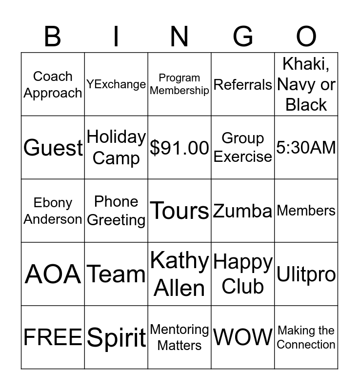 This bingo card has 25 words: Team, Mentoring Matters, $91.00, FREE, Khaki, Navy or Black, Coach Approach, Guest, YExchange, Zumba, Kathy Allen, Group Exercise, Ebony Anderson, Happy Club, Ulitpro, Holiday Camp, Making the Connection, Members, Program Membership, 5:30AM, Phone Greeting, Tours, Spirit, AOA, Referrals and WOW.