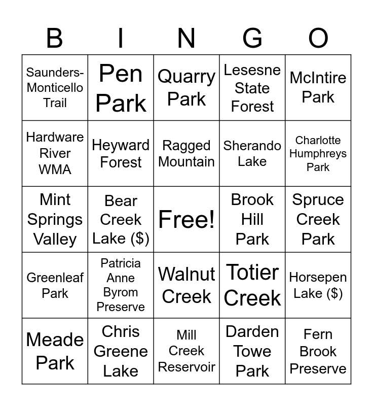 This bingo card has a free space and 34 words: Azalea Park, Darden Towe Park, Forest Hills, Greenbrier Park, Greenleaf Park, Heyward Forest, McIntire Park, Meade Park, Pen Park, Ivy Creek Reserve, Ragged Mountain, Quarry Park, Beaver Creek, Biscuit Run, Brook Hill Park, Charlotte Humphreys Park, Chris Greene Lake, Mint Springs Valley, Patricia Anne Byrom Preserve, Totier Creek, Walnut Creek, Sugar Hollow, Saunders-Monticello Trail, Spruce Creek Park, Mill Creek Reservoir, Fern Brook Preserve, Lesesne State Forest, Scheier Natural Area, Sherando Lake, Hardware River WMA, James River State Park ($), Bear Creek Lake ($), Horsepen Lake ($) and James River WMA ($).