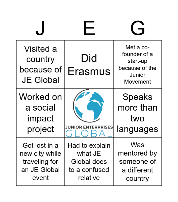 This bingo card has a free space and 8 words: Speaks more than two languages, Met a co-founder of a start-up because of the Junior Movement, Did Erasmus, Got lost in a new city while traveling for an JE Global event, Visited a country because of JE Global, Was mentored by someone of a different country, Worked on a social impact project and Had to explain what JE Global does to a confused relative.