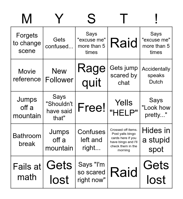 This bingo card has a free space and 89 words: Yells "HELP", Says "Heck yes!", Confuses left and right..., Runs away yelling "NOPE NOPE NOPE NOPE", Gets confused..., Says "OOPS", Says "I need my controller", Says "Wrong Button", Says "Where did you go?", Accidental rolls, Broken technology, Forgets what she was doing..., Hides in a stupid spot, Says "Look how pretty...", Scream, Rage quit, DEATH, Gets played out on a game, Gets distracted with shiny things, Pronounces words wrong, Adventure Time, Sings baby shark, Says "I'm so scared right now", Checks her phone, Jumps off a mountain, Gets lost, Forgets she is muted, New Sub, Gets jump scared by chat, New Follower, Raid, Says "Shouldn't have said that", Sub Goal met, Forgets to change scene, Asks chat for help, Says "excuse me" more than 5 times, Movie reference, Food happy, Accidentally speaks Dutch, Fails at math, Bathroom break, BURP, Disney reference, Stream Crash, Crossed off items. Post yalls bingo cards here if you have bingo and I'll check them in the morning, Yells "HELP", Says "Heck yes!", Confuses left and right..., Runs away yelling "NOPE NOPE NOPE NOPE", Gets confused..., Says "OOPS", Says "I need my controller", Says "Wrong Button", Says "Where did you go?", Accidental rolls, Broken technology, Forgets what she was doing..., Hides in a stupid spot, Says "Look how pretty...", Scream, Rage quit, DEATH, Gets played out on a game, Gets distracted with shiny things, Pronounces words wrong, Adventure Time, Sings baby shark, Says "I'm so scared right now", Checks her phone, Jumps off a mountain, Gets lost, Forgets she is muted, New Sub, Gets jump scared by chat, New Follower, Raid, Says "Shouldn't have said that", Sub Goal met, Forgets to change scene, Asks chat for help, Says "excuse me" more than 5 times, Movie reference, Food happy, Accidentally speaks Dutch, Fails at math, Bathroom break, BURP, Disney reference and Stream Crash.