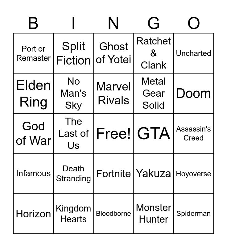 This bingo card has a free space and 24 words: Death Stranding, Kingdom Hearts, Marvel Rivals, Horizon, Uncharted, Port or Remaster, Elden Ring, Split Fiction, GTA, Fortnite, Metal Gear Solid, God of War, Yakuza, Hoyoverse, No Man's Sky, Monster Hunter, Assassin's Creed, Ghost of Yotei, Doom, The Last of Us, Spiderman, Infamous, Ratchet & Clank and Bloodborne.