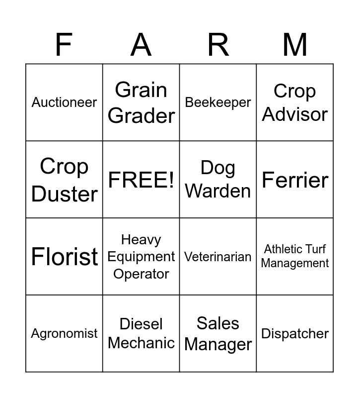 This bingo card has 16 words: Diesel Mechanic, Athletic Turf Management, Beekeeper, Auctioneer, Florist, Grain Grader, Veterinarian, Sales Manager, Crop Duster, FREE!, Agronomist, Crop Advisor, Heavy Equipment Operator, Ferrier, Dog Warden and Dispatcher.