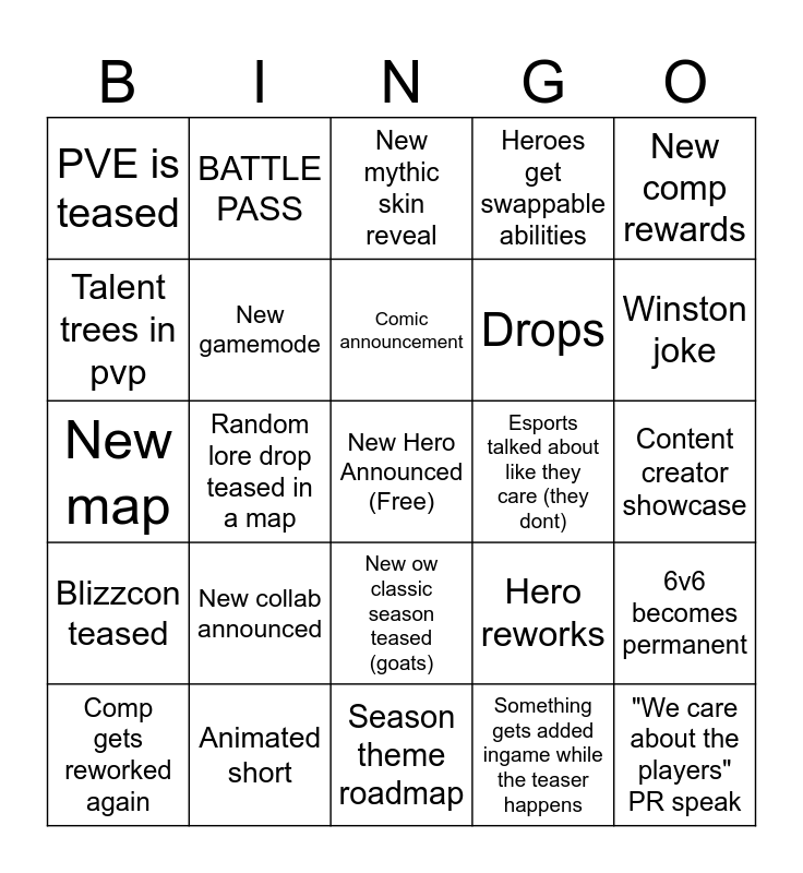 This bingo card has a free space and 24 words: New collab announced, Animated short, Comic announcement, Comp gets reworked again, New comp rewards, PVE is teased, Talent trees in pvp, BATTLE PASS, Esports talked about like they care (they dont), New ow classic season teased (goats), Drops, New map, Hero reworks, 6v6 becomes permanent, New gamemode, Something gets added ingame while the teaser happens, Content creator showcase, New mythic skin reveal, Winston joke, Random lore drop teased in a map, "We care about the players" PR speak, Blizzcon teased, Heroes get swappable abilities and Season theme roadmap.
