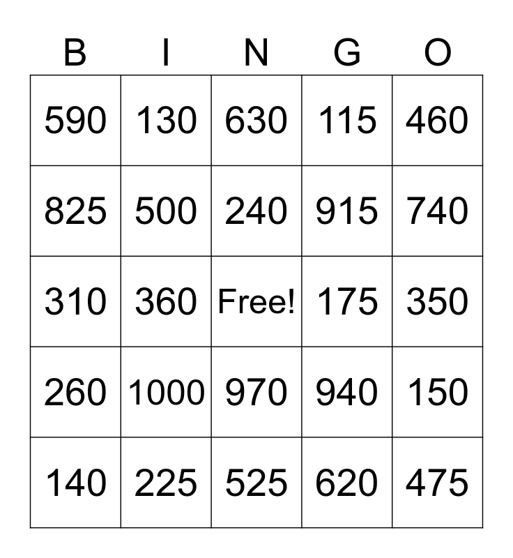 This bingo card has a free space and 29 words: 140, 270, 360, 480, 590, 630, 500, 1000, 175, 225, 350, 475, 525, 620, 740, 880, 970, 260, 460, 310, 940, 615, 915, 825, 115, 130, 150, 240 and 290.