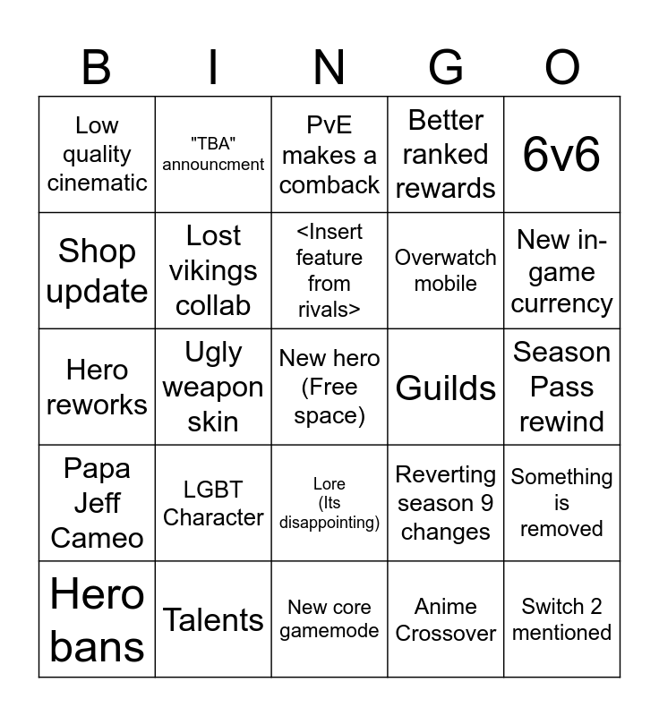 This bingo card has a free space and 24 words: LGBT Character, Talents, <Insert feature from rivals>, Hero bans, 6v6, Low quality cinematic, Shop update, "TBA" announcment, Guilds, Lore (Its disappointing), Overwatch mobile, Hero reworks, Reverting season 9 changes, Something is removed, Lost vikings collab, Anime Crossover, Season Pass rewind, PvE makes a comback, New in-game currency, Ugly weapon skin, Switch 2 mentioned, Papa Jeff Cameo, Better ranked rewards and New core gamemode.