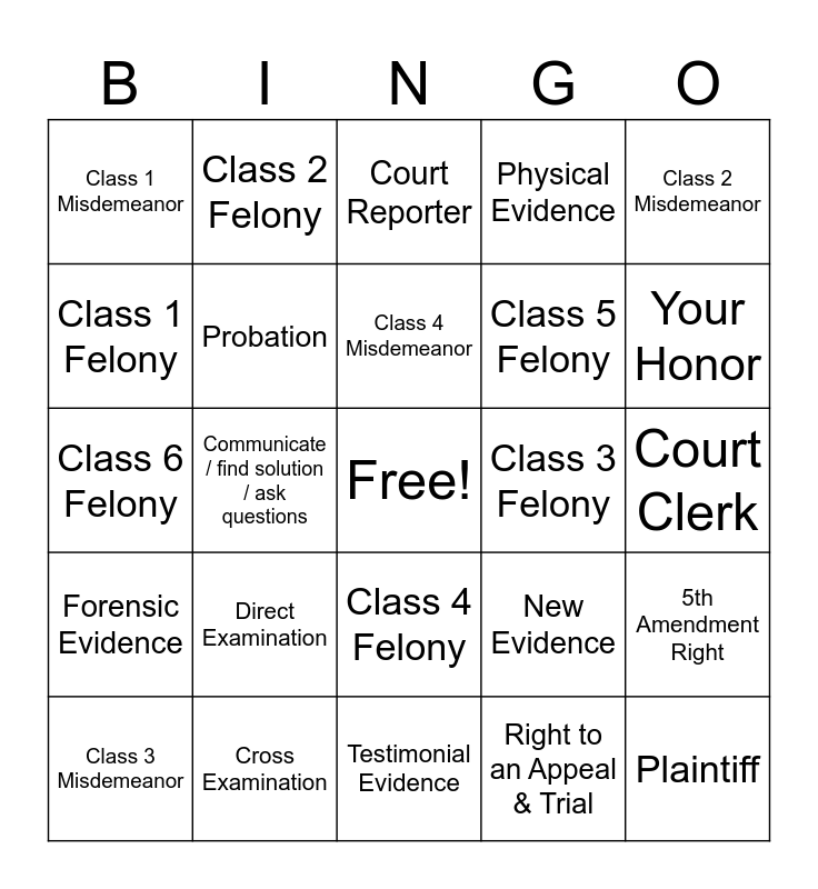 This bingo card has a free space and 24 words: Direct Examination, Cross Examination, Class 4 Misdemeanor, Class 3 Misdemeanor, Class 2 Misdemeanor, Class 1 Misdemeanor, Class 1 Felony, Class 2 Felony, Class 3 Felony, Class 4 Felony, Class 5 Felony, Class 6 Felony, New Evidence, 5th Amendment Right, Probation, Right to an Appeal & Trial, Court Clerk, Court Reporter, Your Honor, Communicate / find solution / ask questions, Plaintiff, Forensic Evidence, Physical Evidence and Testimonial Evidence.