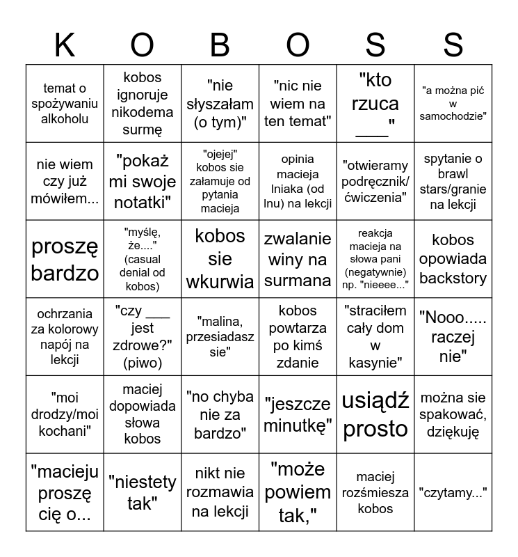 This bingo card has 36 words: "jeszcze minutkę", "no chyba nie za bardzo", "może powiem tak,", nie wiem czy już mówiłem..., ochrzania za kolorowy napój na lekcji, zwalanie winy na surmana, "pokaż mi swoje notatki", nikt nie rozmawia na lekcji, "kto rzuca ___", usiądź prosto, spytanie o brawl stars/granie na lekcji, "nic nie wiem na ten temat", można sie spakować, dziękuję, "myślę, że...." (casual denial od kobos), opinia macieja lniaka (od lnu) na lekcji, temat o spożywaniu alkoholu, "moi drodzy/moi kochani", reakcja macieja na słowa pani (negatywnie) np. "nieeee...", proszę bardzo, "nie słyszałam (o tym)", kobos sie wkurwia, "czy ___ jest zdrowe?" (piwo), kobos powtarza po kimś zdanie, "malina, przesiadasz sie", "straciłem cały dom w kasynie", kobos ignoruje nikodema surmę, "otwieramy podręcznik/ćwiczenia", "niestety tak", "ojejej" kobos sie załamuje od pytania macieja, "a można pić w samochodzie", "czytamy...", "macieju proszę cię o..., "Nooo..... raczej nie", kobos opowiada backstory, maciej dopowiada słowa kobos and maciej rozśmiesza kobos.