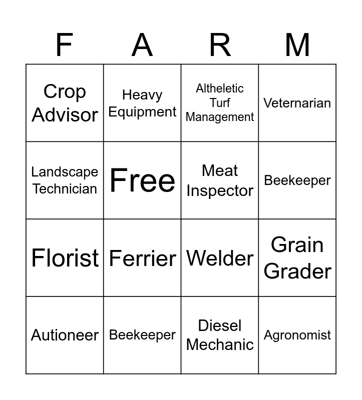 This bingo card has 16 words: Beekeeper, Grain Grader, Altheletic Turf Management, Crop Advisor, Florist, Heavy Equipment, Welder, Diesel Mechanic, Landscape Technician, Free, Autioneer, Veternarian, Ferrier, Beekeeper, Meat Inspector and Agronomist.