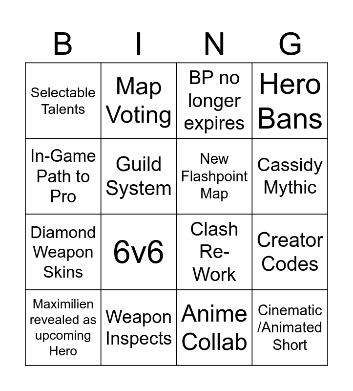 This bingo card has 16 words: Weapon Inspects, Creator Codes, BP no longer expires, Selectable Talents, Diamond Weapon Skins, Map Voting, Clash Re-Work, Anime Collab, In-Game Path to Pro, Guild System, Maximilien revealed as upcoming Hero, Hero Bans, 6v6, Cassidy Mythic, New Flashpoint Map and Cinematic /Animated Short.