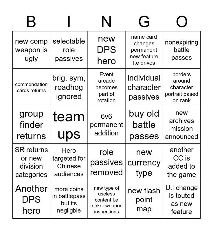 This bingo card has a free space and 24 words: Another DPS hero, Hero targeted for Chinese audiences, Event arcade becomes part of rotation, new flash point map, nonexpiring battle passes, new comp weapon is ugly, selectable role passives, new DPS hero, buy old battle passes, new archives mission announced, group finder returns, brig. sym, roadhog ignored, new currency type, another CC is added to the game, commendation cards returns, more coins in battlepass but its negligble, new type of useless content I.e trinket weapon inspections, name card changes permanent new feature I.e drives, borders around character portrait based on rank, SR returns or new division categories, team ups, role passives removed, individual character passives and U.I change is touted as new feature.