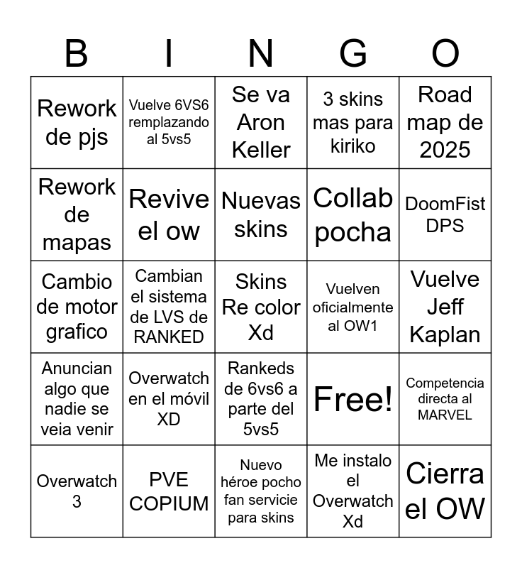 This bingo card has 25 words: Overwatch en el móvil XD, Nuevo héroe pocho fan servicie para skins, Nuevas skins, Overwatch 3, Road map de 2025, Rework de pjs, Rework de mapas, Vuelve 6VS6 remplazando al 5vs5, Vuelven oficialmente al OW1, Rankeds de 6vs6 a parte del 5vs5, Collab pocha, Cambio de motor grafico, Free!, Competencia directa al MARVEL, Revive el ow, Cierra el OW, Vuelve Jeff Kaplan, Se va Aron Keller, DoomFist DPS, Cambian el sistema de LVS de RANKED, Skins Re color Xd, PVE COPIUM, Anuncian algo que nadie se veia venir, 3 skins mas para kiriko and Me instalo el Overwatch Xd.