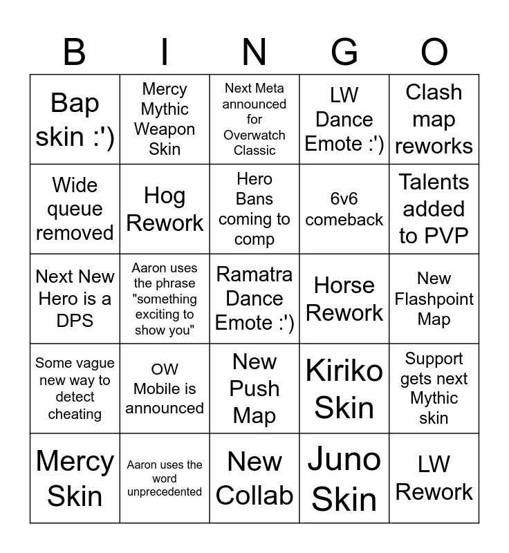 This bingo card has 25 words: OW Mobile is announced, New Collab, Hero Bans coming to comp, Mercy Skin, Clash map reworks, Bap skin :'), Wide queue removed, Mercy Mythic Weapon Skin, Horse Rework, New Push Map, 6v6 comeback, Next New Hero is a DPS, Kiriko Skin, Support gets next Mythic skin, Hog Rework, LW Rework, New Flashpoint Map, Next Meta announced for Overwatch Classic, Talents added to PVP, Aaron uses the phrase "something exciting to show you", Ramatra Dance Emote :'), Aaron uses the word unprecedented, Some vague new way to detect cheating, LW Dance Emote :') and Juno Skin.