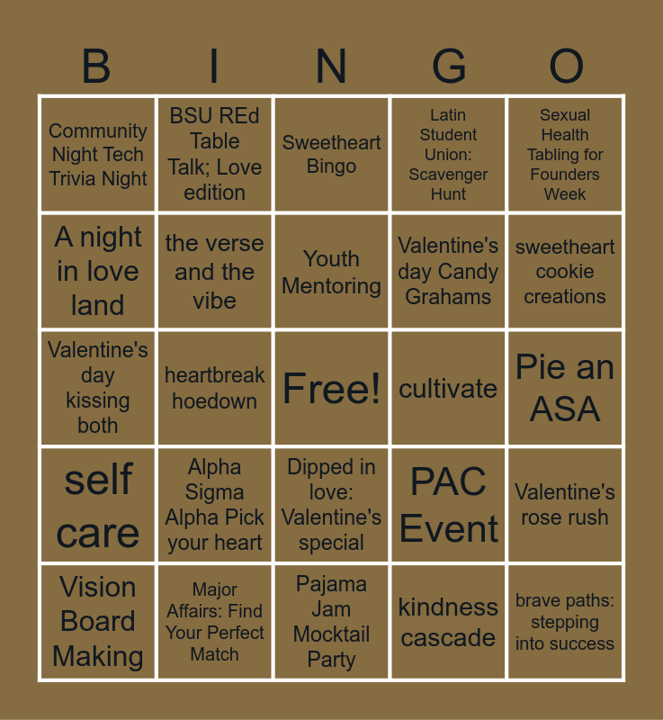 This bingo card has a free space and 24 words: Alpha Sigma Alpha Pick your heart, Major Affairs: Find Your Perfect Match, Youth Mentoring, Vision Board Making, Sexual Health Tabling for Founders Week, Community Night Tech Trivia Night, A night in love land, BSU REd Table Talk; Love edition, cultivate, Dipped in love: Valentine's special, Valentine's day Candy Grahams, Valentine's day kissing both, PAC Event, Valentine's rose rush, the verse and the vibe, kindness cascade, Pie an ASA, Sweetheart Bingo, sweetheart cookie creations, heartbreak hoedown, brave paths: stepping into success, self care, Latin Student Union: Scavenger Hunt and Pajama Jam Mocktail Party.