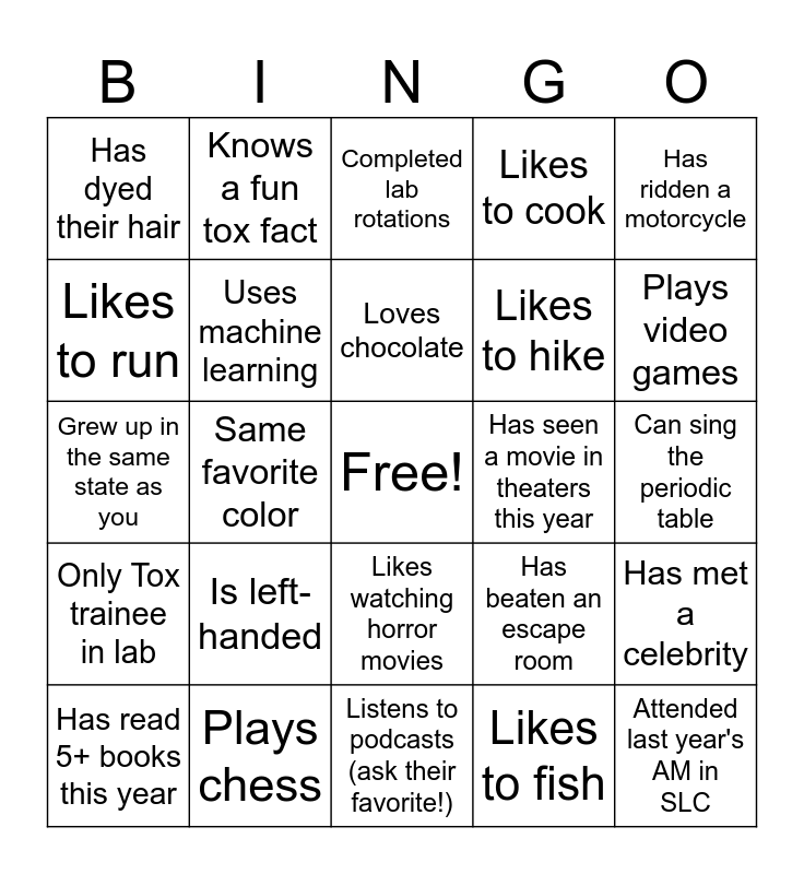This bingo card has a free space and 95 words: Has been in a band or orchestra, Has lived in 3+ states, Likes to fish, Likes to bake, Prefers tea over coffee, Is a swimmer, Plays poker, Plays chess, Likes to do karaoke, Star Wars fan, Has played Pokemon or Pokemon Go, Has been skydiving, Has broken a bone, Loves chocolate, Wears glasses, Has dyed their hair, Plays video games, Likes board games, Lives in Florida, Same birth month, Traveled this summer, Has 3 plants at home or in their office, Has a reptile, Has a dog or cat, Likes to cook, Likes to run, Likes to bike, Likes to hike, Has run a half or full marathon, Knows martial arts, Is left-handed, Knows 2+ languages, Has a tattoo, Likes pineapple on pizza, Has read 5+ books this year, Can play an instrument, Listens to podcasts (ask their favorite!), Grew up in a different state/country than you, Grew up in the same state as you, Has an interesting hobby (ask them about it!), Has met a celebrity, Same favorite color, Likes watching horror movies, Has ridden a motorcycle, Has beaten an escape room, Has seen a movie in theaters this year, Has binged a TV series, Drinks 2+ coffee/day, Is a night owl, Took a gap year, Watches sports, Is a morning person, Likes to volunteer, Wearing fun socks!, Has attended a conference abroad/internationally, Works with rats or mice, Works with zebrafish, Studies heavy metals, Studies persistent organic pollutants, Published a paper in Toxicological Sciences, Uses machine learning, Has done cell culture experiments, Seen the movie "Dark Waters", Same school for undergrad and grad, Attended their last regional chapter meeting, Read "Silent Spring", Loves chemistry, Loves genetics, Completed lab rotations, Presenting a poster, Mentors an undergrad student, Has an ResearchGate profile, Attended last year's AM in SLC, Is a part of another Toxicology society, Is a postdoctoral fellow, Is a TA, Same undergraduate major, Knows a coding language (R, python, etc.), Does bioinformatic analysis, Knows a fun tox fact, Won a travel award, Presenting a platform talk (ask when), Participated in a CE course, Watched a Tox documentary this year, Can sing the periodic table, Only Tox trainee in lab, Has a Master’s degree, Has visited Disneyland/DisneyWorld, Loves roller caosters, Seen a real alligator in the wild, Has done an internship, Has experienced a major lab disaster, unusual route to grad school, Holds a leadership role at SOT and SOT newbie.