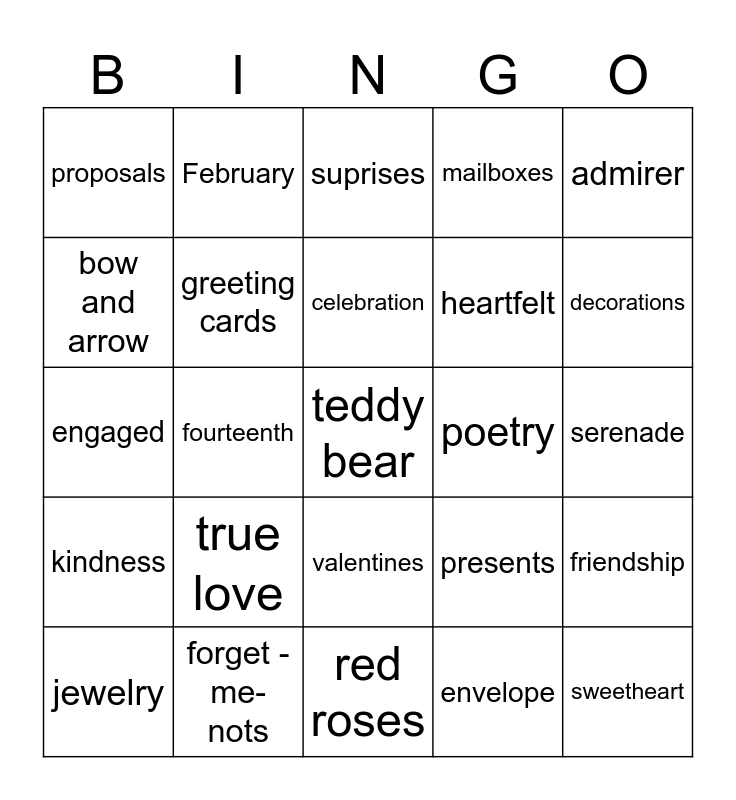 This bingo card has 34 words: sweetheart, envelope, bouquets, conversation hearts, kindness, greeting cards, admirer, jewelry, February, cupid, celebration, suprises, romantic, chocolates, poetry, decorations, forget -me-nots, engaged, true love, presents, valentines, sentimental, proposals, serenade, red roses, teddy bear, mailboxes, appreciation, heartfelt, bow and arrow, carnations, fourteenth, friendship and flower vase.