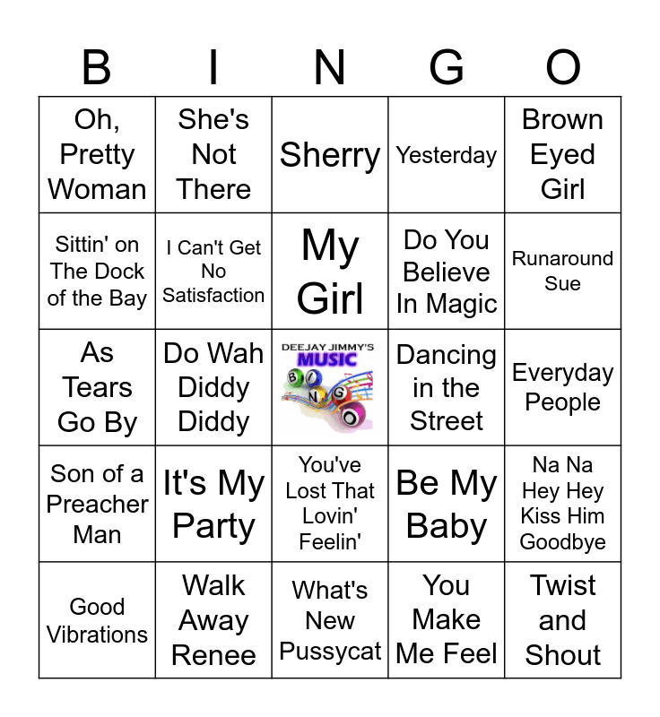 This bingo card has a free space and 39 words: Stop! In The Name of Love, Respect, I Heard It Through The Grapevine, I Can't Get No Satisfaction, Good Vibrations, You've Lost That Lovin' Feelin', My Girl, She Loves You, Brown Eyed Girl, Son of a Preacher Man, Do Wah Diddy Diddy, Yesterday, Twist and Shout, Everyday People, Dancing in the Street, It's My Party, Happy Together, Oh, Pretty Woman, These Boots Are Made for Walkin', Be My Baby, Sittin' on The Dock of the Bay, What's New Pussycat, Do You Believe In Magic, Runaround Sue, Big Girls Don't Cry, Ain't Too Proud To Beg, I Got You (I Feel Good), My Boyfriend's Back, Can't Take My Eyes Off You, She's Not There, Under The Boardwalk, I'm a Believer, Sherry, Walk Away Renee, You Make Me Feel, The Twist, Na Na Hey Hey Kiss Him Goodbye, As Tears Go By and Monday, Monday.